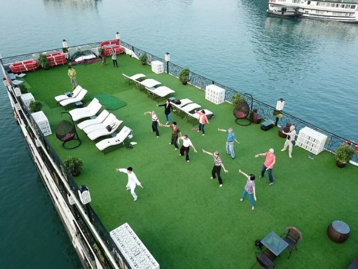 Sân phơi – Sundeck rộng rãi và có khu mái che, thích hợp cả thời tiết nắng và mưa. Đây cũng là địa điểm lý tưởng nhất để quý khách nằm phơi nắng, nghỉ ngơi hoặc chụp ảnh toàn cảnh Vịnh Hạ Long.